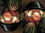 Generano stupore anche i due esempi di teste reversibili presenti in mostra: L’Ortolano e Il Cuoco, (il primo dal Museo Civico di Cremona e il secondo proveniente da Stoccolma) immagini di nature morte che ruotate a 180° assumono una conformazione completamente diversa. Maestro del gioco e dell’ironia, Arcimboldo riprendendo il filone leonardesco e lombardo della caricatura con profili di uomini e donne dai lineamenti esagerati che sfociano nel ridicolo (da qui anche il nome di pitture ridicole), si fa originale interprete di questo genere attraverso le sue teste caricate di cui la mostra ci presenta due capolavori: Il Giurista e Il Bibliotecario surreali personificazioni dei mestieri. Il Giurista in veste di Azzeccagarbugli ha il colletto che è un’insieme di scartoffie e il volto formato da animali tra cui i famosi capponi di manzoniana memoria; il Bibliotecario ha una zazzera formata dalle pagine di un libro aperto e il corpo composto da grossi volumi.